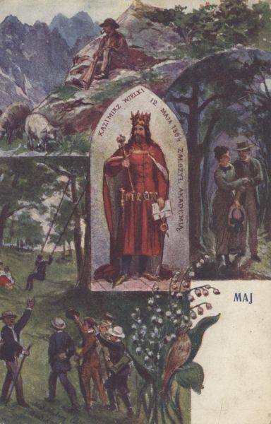 Pocztówka pt. Maj wg. obrazów Walerego Eljasza - Radzikowskiego przedstawiająca sceny rodzajowe z Tatr oraz postać Kazimierza Wielkiego.