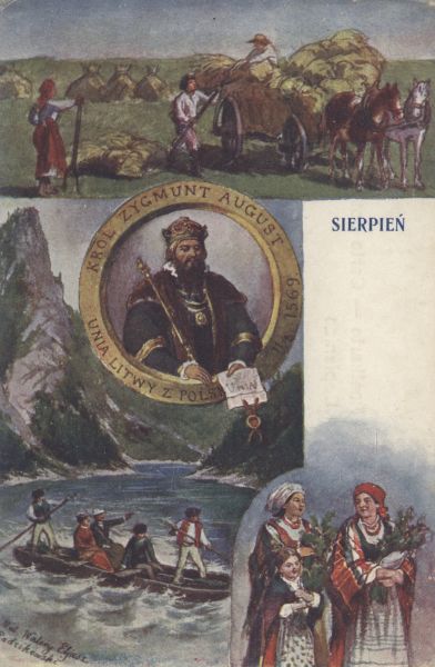 Pocztówka pt. Sierpień wg. obrazów Walerego Eljasza - Radzikowskiego przedstawiająca sianokosy, Przełom Dunajca oraz kobiety z kwiatami. Pośrodku postać Zygmunta II Augusta.