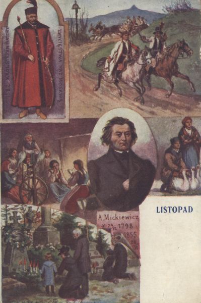 Pocztówka pt. Listopad wg. obrazów Walerego Eljasza - Radzikowskiego przedstawiająca sceny rodzajowe z życia Polaków oraz postaci Stefana Batorego i Adama Mickiewicza.