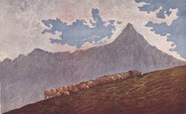 Reprodukcja obrazu Stanisława Eljasza - Radzikowskiego przedstawiającego pejzaż z owcami na hali.