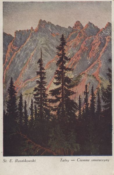 Reprodukcja obrazu Stanisława Eljasza - Radzikowskiego pt. Tatry - Ciemne smereczyny. Pod reprodukcją wydrukowany tytuł.