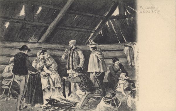 Reprodukcja obrazu Walerego Eljasza - Radzikowskiego pt. "W szałasie wsród słoty".