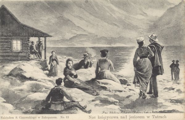 Reprodukcja obrazu Walerego Eljasza - Radzikowskiego pt. "Noc księżycowa nad jeziorem w Tatrach".