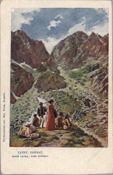 Reprodukcja obrazu Walerego Eljasza - Radzikowskiego pt. Tatry: Zawrat. Pod reprodukcją wydrukowany tytuł, także w języku: niem. Na marginesie po lewej stronie wydawca.