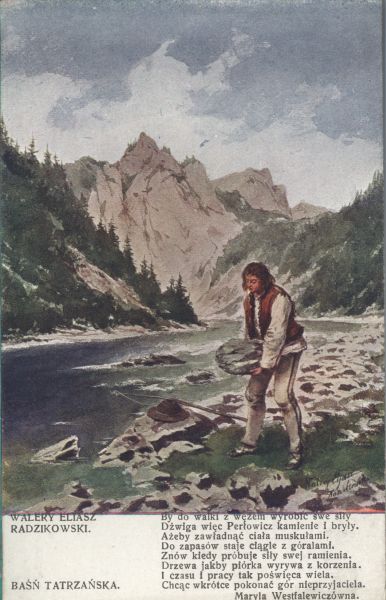 WALERY ELIASZ RADZIKOWSKI. BAŚŃ TATRZAŃSKA. By do walki z wężem wyrobić swe siły Dźwiga więc Perłowicz kamienie i bryły. Ażeby zawładnąć ciała muskułami. Do zapasów staje ciągle z góralami. Znów kiedy próbuje siły swej ramienia. Drzewa jakby piórka wyrywa z korzenia. I czasu i pracy tak poświęca wiele. Chcąc wkrótce pokonać gór nieprzyjaciela. Maryla Westfalewiczówna.