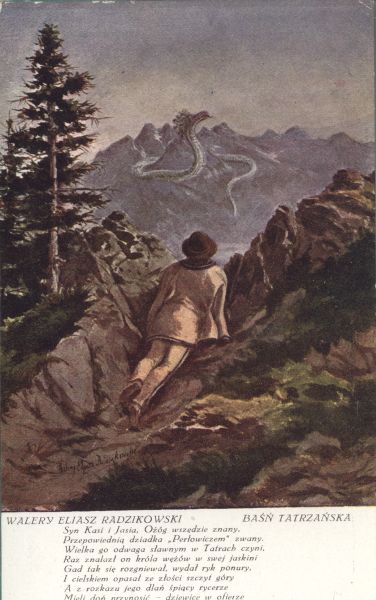 WALERY ELIASZ RADZIKOWSKI. BAŚŃ TATRZAŃSKA. Syn Kasi i Jasia, Ozóg wszędzie znany, Przepowiednią dziadka "Perłowiczem" zwany, Wielka go odwaga sławnym w Tatrach czyni, Raz znalazł on króla wężów w swej jaskini. Gad tak się rozgniewał, wydał ryk ponury. I cielskiem opasał ze złości szczyt góry A z rozkazu jego dlań śpiący rycerze Mieli doń przynosić - dziewice w ofierze. Maryla Westfalewiczówna.