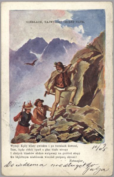 Reprodukcja obrazu Walerego Eljasza - Radzikowskiego pt. Gerlach, najwyższy szczyt Tatr. U góry wydrukowany tytuł. Pod reprodukcją w miejscu na korespondencję wydrukowany wiersz. Korespondencja.