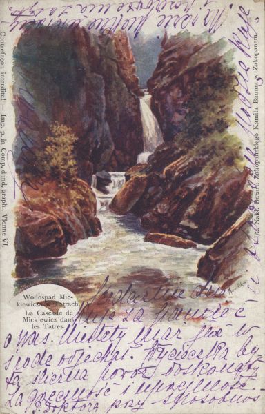 Reprodukcja obrazu Marii Eljasz pt. "Wodospad Mickiewicza w Tatrach". Korespondencja.