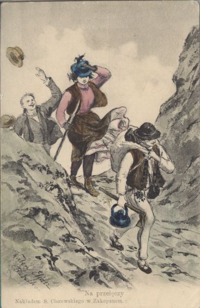 Reprodukcja obrazu Walerego Eljasza - Radzikowskiego pt. Na przełęczy. Pod reprodukcją wydrukowany tytuł i nakładca.