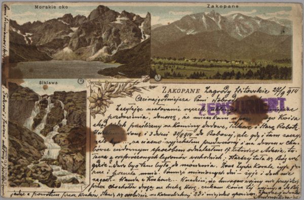 Pocztówka użyta w obiegu pocztowym, korespondencja. Długi adres. Dodatkowo stempel cenzury wojskowej.