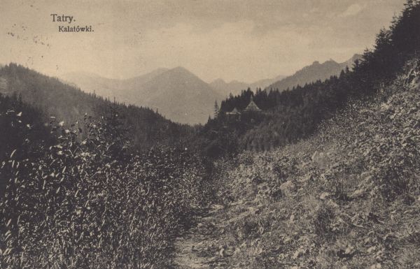 Klasztor Albertynek na Kalatówkach. W tle Goryczkowa Czuba. U góry wydrukowany tytuł.