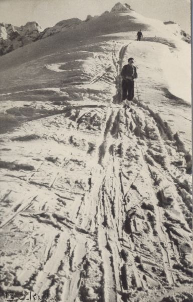 Narciarz na Beskidzie w zimie. W tle Mały Kozi Wierch i Świnica. Na dole po lewej stronie wpisany tytuł.