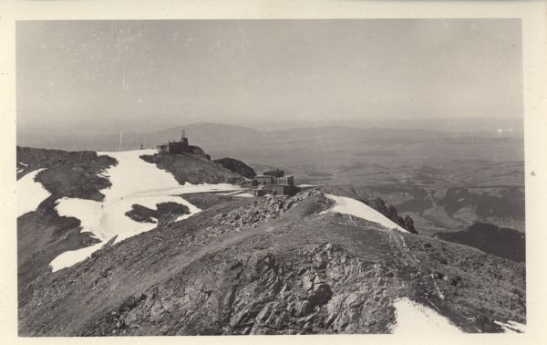 Obserwatorium meteorologiczne i górna stacja kolei linowej na Kasprowym Wierchu. W tle Babia Góra.