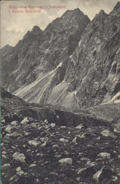 Mały Hińczowy Staw w Dolinie Hińczowej. W tle Pośrednia Baszta i Szatan. U góry po lewej stronie wydrukowany tytuł.