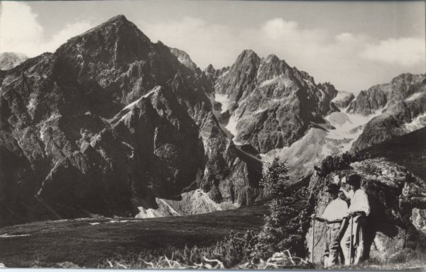 Otoczenie Zielonego Stawu Kieżmarskiego. Mały Kieżmarski Szczyt, Durny Szczyt i Barania Przełęcz. Na pierwszym planie z prawej stoi dwoje górali.