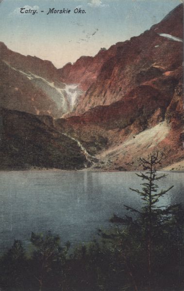 Widok znad Morskiego Oka na Żabiego Konia. U góry po lewej stronie wydrukowany tytuł.
