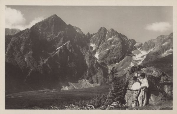 Otoczenie Zielonego Stawu Kieżmarskiego. Mały Kieżmarski Szczyt, Durny Szczyt i Barania Przełęcz. Na pierwszym planie z prawej stoi dwóch górali.