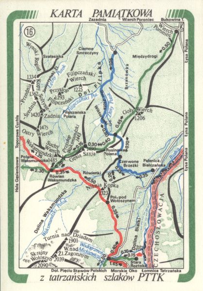 Karta pamiątkowa z tatrzańskich szlaków PTTK - szkic mapy okolic Rusinowej Polany.