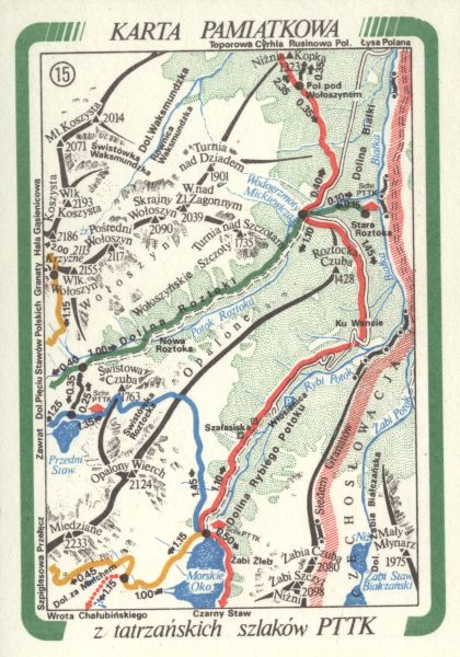 Karta pamiątkowa z tatrzańskich szlaków PTTK - szkic mapy okolic Doliny Roztoki.