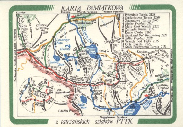 Karta pamiątkowa z tatrzańskich szlaków PTTK - szkic mapy okolic Orlej Perci.