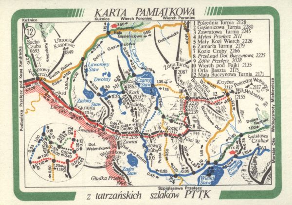 Karta pamiątkowa z tatrzańskich szlaków PTTK - szkic mapy okolic Orlej Perci.
