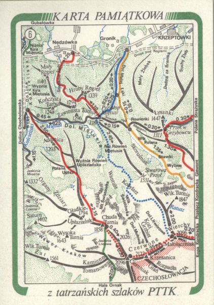 Karta pamiątkowa z tatrzańskich szlaków PTTK - szkic mapy okolic Doliny Miętusiej.