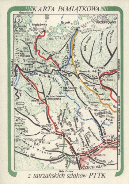 Karta pamiątkowa z tatrzańskich szlaków PTTK - szkic mapy okolic Doliny Miętusiej.