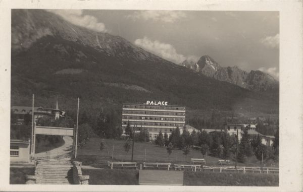 Vysoké Tatry - Novę Smokovec 1010 m. Lieèebnę dom "Palace". Slavkovskę 2453 m a Lomnickę čtít 2634 m.