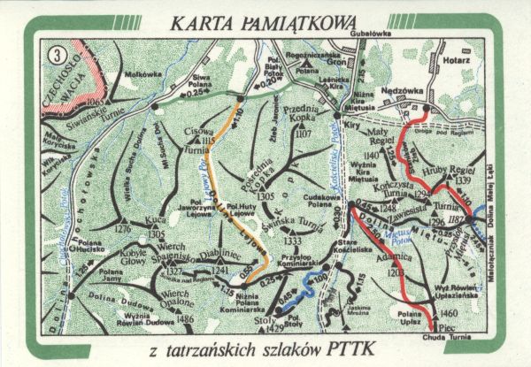 Karta pamiątkowa z tatrzańskich szlaków PTTK - szkic mapy okolic Doliny Lejowej.