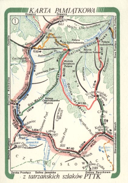 Karta pamiątkowa z tatrzańskich szlaków PTTK - szkic mapy okolic Schroniska PTTK na Polanie Chochołowskiej.