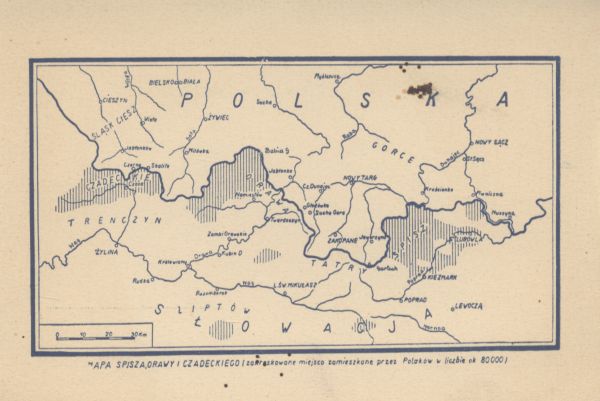 MAPA SPISZA, ORAWY I CZADECKIEGO (zakreskowane miejsca zamieszkałe przez Polaków w liczbie ok. 80 000).