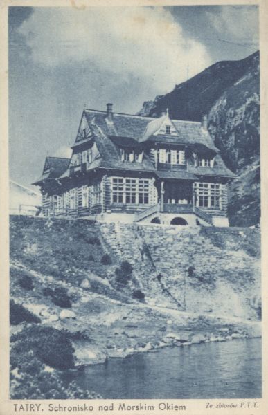 Schronisko nad Morskim Okiem w Dolinie Rybiego Potoku. Pod zdjęciem wydrukowany tytuł.