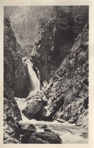 Wodogrzmoty Mickiewicza w Dolinie Roztoki. Nad wodospadem widoczny most.