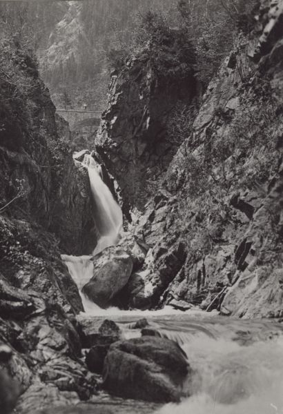 Wodogrzmoty Mickiewicza w Dolinie Roztoki. Nad wodospadem widoczny most.