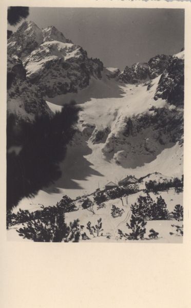 Otoczenie Zielonego Stawu Kieżmarskiego w zimie, Dolina Dzika. Z lewej Durny Szczyt, pośrodku Barania Przełęcz. W dole widoczny dach schroniska.