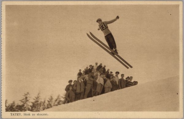 Zawodnik podczas skoku ze skoczni. Z tyłu grupa widzów.