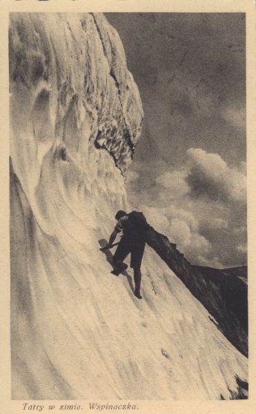 Taternik wspinający się zimą. Pod zdjęciem wydrukowany tytuł.