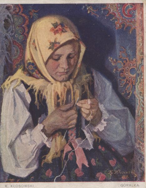 Reprodukcja obrazu Karola Kłosowskiego pt. Góralka. Pod reprodukcją wydrukowany tytuł.