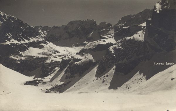 Czarny Staw G±sienicowy w zimie. W tle Kozi Wierch. Na ¶rodku zdjęcia po prawej stronie wpisany tytuł.
