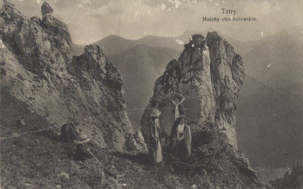 Turyści na Mnichach Chochołowskich. W dole z prawej Polana Chochołowska. U góry po prawej stronie drukowany tytuł.
