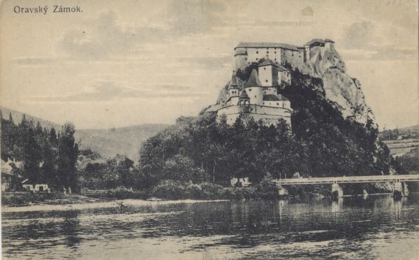 Zamek Orawski nad Orawskim Podzamczem. W dole p³ynie Orawa. U góry po lewej stronie wydrukowany tytu³.