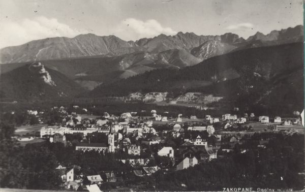 Widok ogólny na Zakopane ze zboczy Gubałówki. W tle panorama Tatr Wysokich. Na dole po prawej stronie wpisany tytuł.