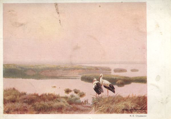 Reprodukcja obrazu K. E. Olszewskiego przedstawiającego bociany nad jeziorem.