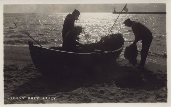 Rybacy przy pracy. Na dole po lewej stronie wpisany tytuł.