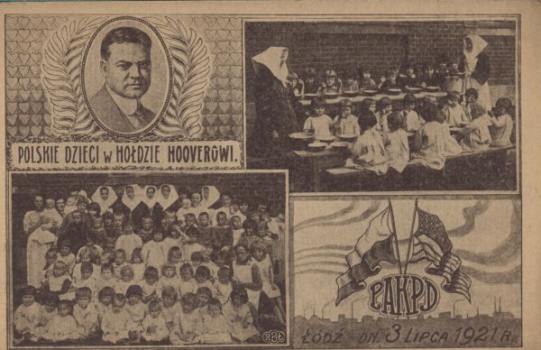 Pocztówka 4. elementowa: portret Herberta Clarka Hoovera. Dzieci z ochronek. Afisz akcji P. A. K. P. D. w Łodzi.