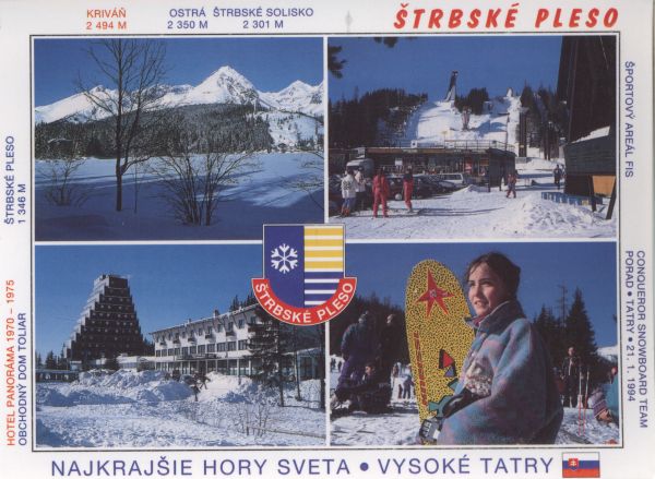 Pocztówka 4. elementowa: Widok znad Szczyrbskiego Jeziora zim± na Krywań, Solisko i Szczyrbski Szczyt. Skocznia narciarska. Hotel Panorama. Narciarka. Pomiędzy zdjęciami herb: ©TRBSKÉ PLESO. Na marginesach dookoła zdjęć opisy fotografii oraz napisy: ©TRBSKÉ PLESO i NAJKRAJ©IE HORY SVETA * VYSOKÉ TATRY. Dodatkowo flaga Słowacji.