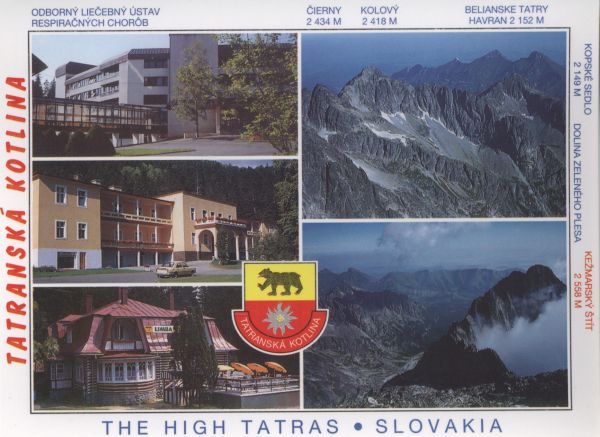 Pocztówka 5. elementowa: Sanatorium i pensjonat Limba w Tatrzańskiej Kotlinie. Widok z Łomnicy na Kołowy Szczyt, Jagnięcy Szczyt i Kieżmarski Szczyt. Pomiędzy zdjęciami herb: TATRANSKÁ KOTLINA. Na marginesach dookoła zdjęć opisy fotografii oraz napisy: TATRANSKÁ KOTLINA i THE HIGH TATRAS. * SLOVAKIA.