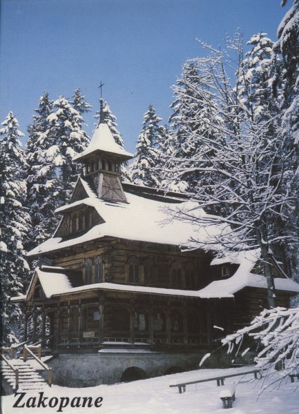 Widok na ośnieżoną Kaplicę Witkiewicza w Jaszczurówce w Zakopanem. Napis: Zakopane.