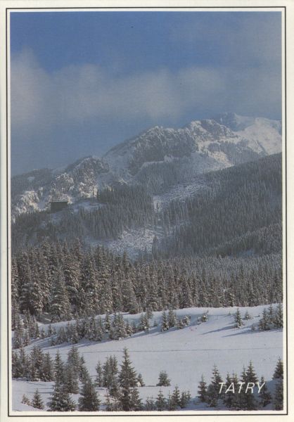 Widok z Hali Kondratowej na Myślenickie Turnie i Zawrat Kasprowy w zimowej scenerii. Napis: TATRY.