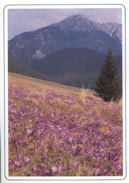 Krokusy (Crocus scepusiensis) wiosną na Polanie Chochołowskiej. W tle Kominiarski Wierch.